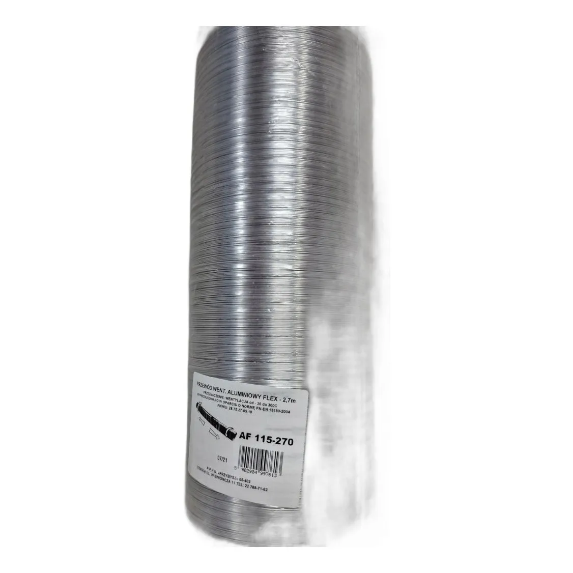 Przewód aluminiowy o średnicy 115 mm i długości 2,7 metra. Idealny do montażu systemów wentylacyjnych w domu i warsztacie.