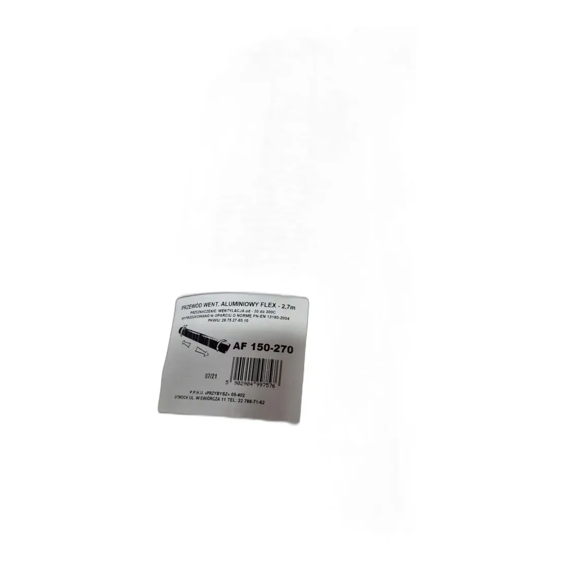 Giętki przewód aluminiowy o średnicy 150 mm i długości 2,7 m. Używany w instalacjach wentylacyjnych i klimatyzacyjnych. Lekki i łatwy w montażu.